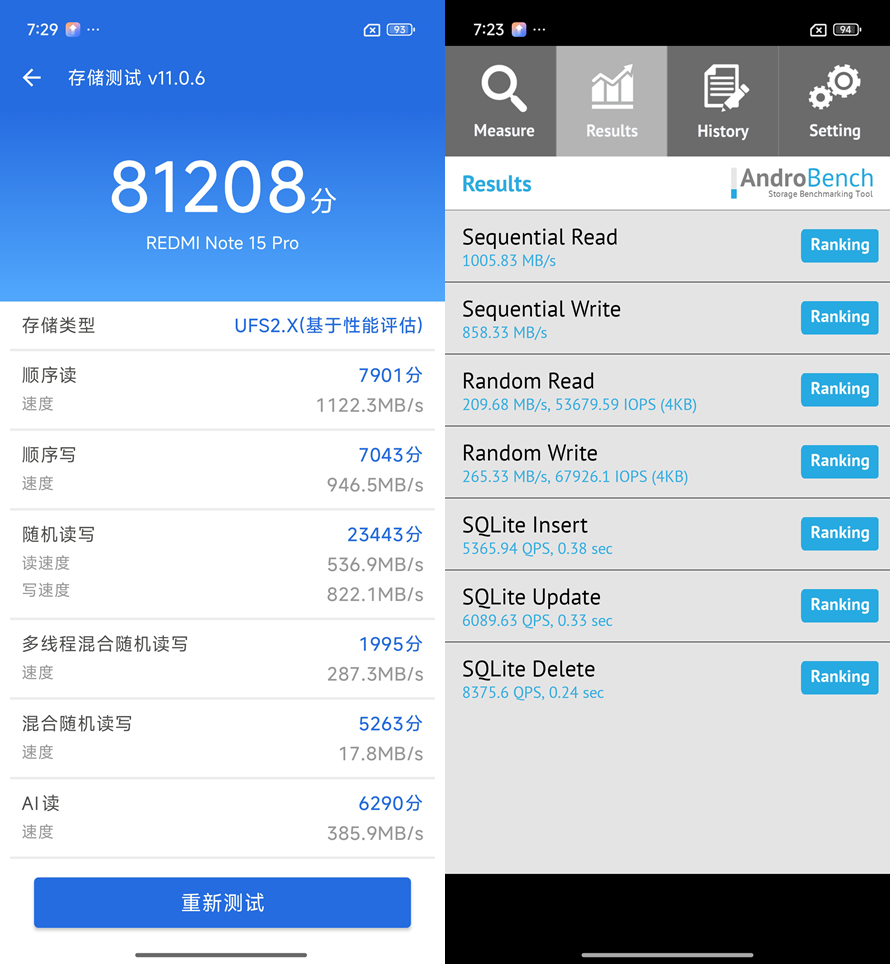 在使用安兔兔进行单独的存储测试,发现其持续读取速度达到了1122.3MB/s,写入速度则是946.5MB/s,这个成绩相当给力。除了安兔兔之外,我们使用AndroBench进行闪存速度的测试,REDMI Note 15 Pro手机的顺序读取速度为1005MB/s,写入速度则为858MB/s,也基本符合预期。