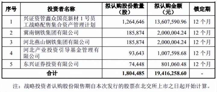 海牛投研1月12日,国亮新材(920076)北交所IPO战投名单出炉盛盈优配,引入兴证资管鑫众国亮新材1号员工战略配售集合资产管理计划 、冀南钢铁集团有限公司等5家战投共拟认购180.45万股。